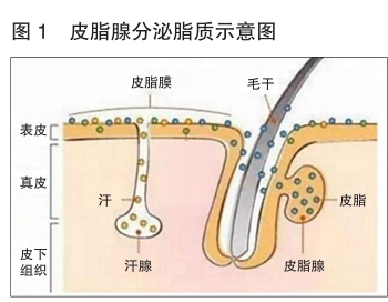 皮脂腺脂质来源于皮脂腺分泌的脂质,承担着润泽皮肤及屏障作用,其成分主要包括甘油三酯、脂肪酸、角鲨烯、蜡酯、胆固醇和胆固醇酯。在皮脂腺中,新生成的腺体细胞逐渐增大,并向皮脂腺腺泡中心移动,同时在细胞质中形成越来越多的小脂滴,随后固缩、细胞器消失,最后腺体细胞死亡和解体,排出脂滴(详见图1)。脂滴到达皮脂腺导管,通过分泌到达皮肤表面,约占SSLs的75%~90%。