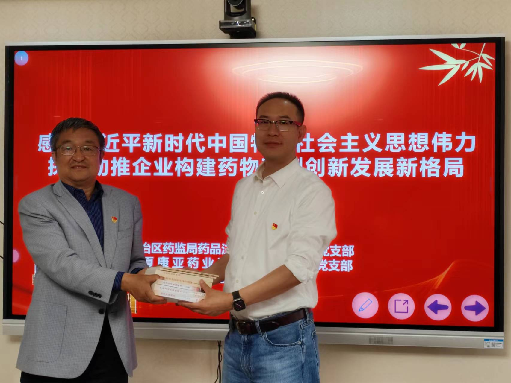 活动最后,药品注册和生产监管处党支部参观了企业的研发中心,并向宁夏康亚药业股份有限公司党支部赠送主题教育学习书目,落实党建引领业务的监管要求。
